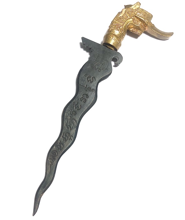 This caused the Royal Courtiers and Entourages to acquire these daggers, and wear them as Royal decorative Regalia in Public Appearance. The Grich, 'Kris' or 'Thai Keris', is a magical Ceremonial/Ritual weapon which is used by Buddhist, Hindu and Muslims.