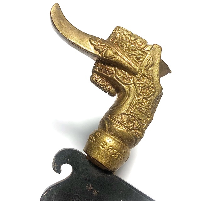 The hilt and butt of the Grich is fashioned in the form of a Hongsa Golden Swan. The Golden Hongsa was a previous Incarnation of the Lord Buddha Sakyamuni, and is endowed with immense Metta Mahaniyom magical qualities, attracting auspicious blessings to the household, and warding off demons with its purity and bright aura of light.