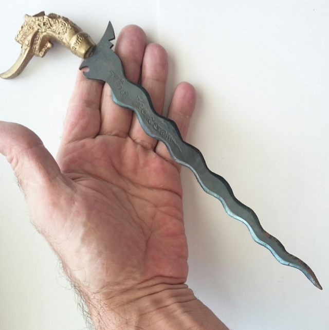 This is the 7 inch long (9 inches in total with handle) version of a limited edition series of ceremonial Ritual dagger, which were made in straight versions too in 2, 5 and 7 and 9 inches in length.