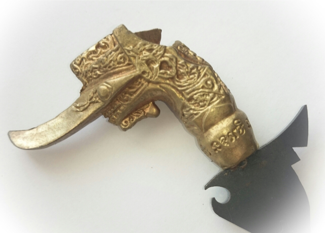 The hilt and butt of the Grich is fashioned in the form of a Hongsa Golden Swan. The Golden Hongsa was a previous Incarnation of the Lord Buddha Sakyamuni, and is endowed with immense Metta Mahaniyom magical qualities, attracting auspicious blessings to the household, and warding off demons with its purity and bright aura of light.