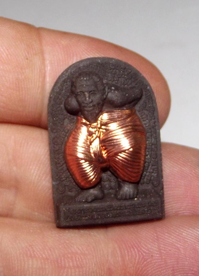 This is the black powder version (Nuea Maha Wan Dam Gang Geng Tong Daeng) with Sacred Copper trousers affixed to the image. The muan sarn powders of the versions with metal trousers are visibly richer in powerful components, herbs, pollens, kayayaks earths and minerals. White powders are more Puttakun and Metta orientated whereas Black powders are more Kong Grapan and Anti Black Magic. The rear face actually has an Ancient Yantra inscription upon it with 10,000 Sacred Invocations, as do all amulets in this edition, which uses the Wicha of the Great Hmeun (10,000) Yant to empower with.