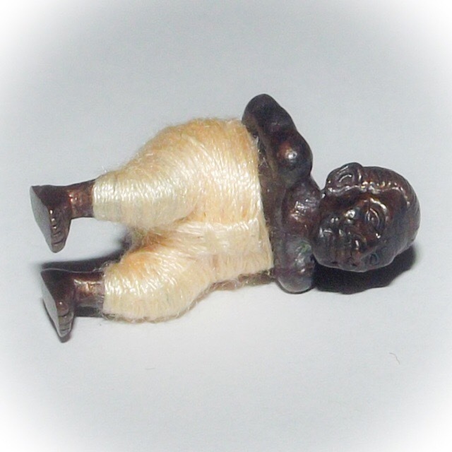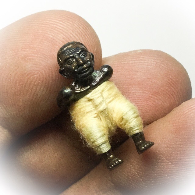 The 'Hua Jai Dta Ba Khaw spell was invoked to instill the heart of the Dta Ba Khaw entity within the effigy using colored daay mongkol cords in the clockwise direction to wind the heart inside the chest to the left side. The Hun Payont is given trousers that have seven strips around the waist, meaning 'Sang Wi Taa Bu Ga Ya Ba' (7 Syllable Kata of the Abhidhamma).
