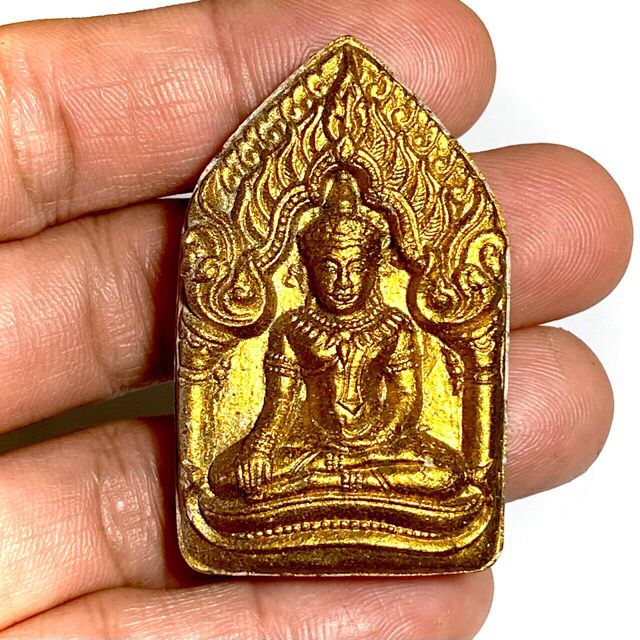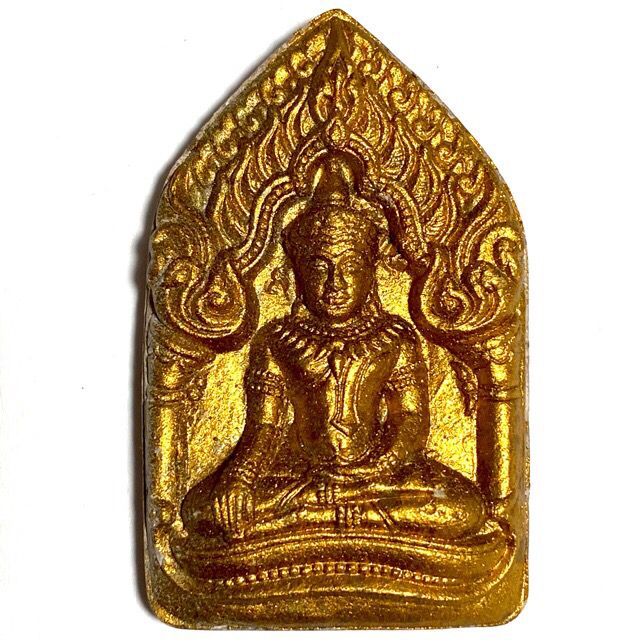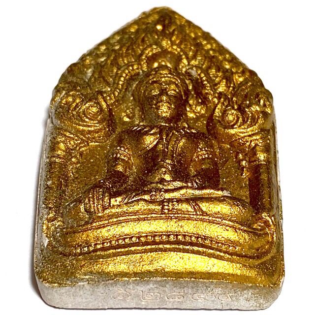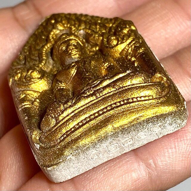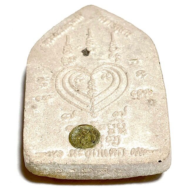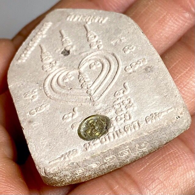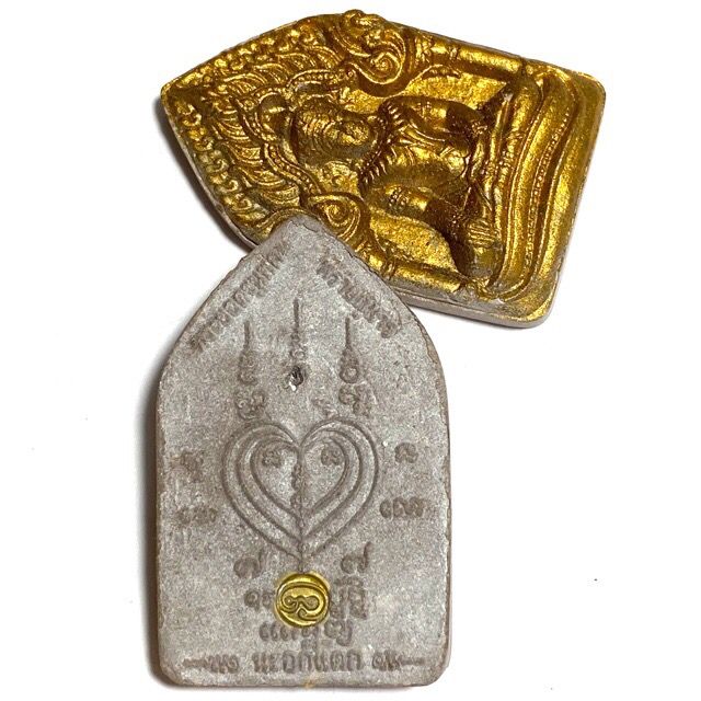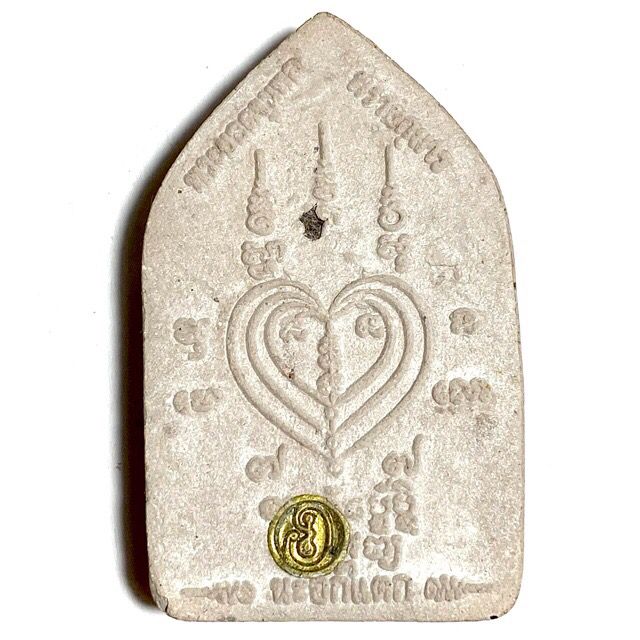 This particular model is in Nuea Pong Pra Kumarn pasom Pong Puttakun white powders'. The amulets were made in Pim Yai (large) and Pim Lek (small) models, with gold leaf pasted on the front face (of this model, howver not all models had gold leaf). The rear face has a single Takrut Tong Daeng (sacred copper alloy), with fragments of Ploi Sek maha Pokasap gems sprinkled into the rear face of the sacred powder amulet.