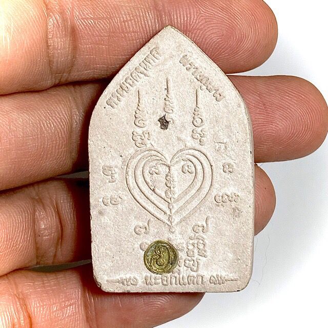 Pra Khun Phaen Hlang Na Ok Dtaek (broken heart Yantra on rear face) 'Fang Chin Aathan' (Necromantic piece of Kumarn Bone, or other Necromantic ingredient insert), and Look Namo Slug on rear face, in concentrated rich Necromantic Nuea Pong Prai Kumarn. Released in the Prai Tong 2556 BE Edition, this model is a Pim Yai (Large Pim Model). BLessed by Luang Por Sakorn, of Wat Nong Grub (Rayong). This is a special model in white Pong Prai Kumarn powders with a Look Namo slug spell and a piece of Chin Aathan, Necromantic substance inserted into the rear face, and was one of a very few 'secret models' released, in this in any case very small numbered edition. This series, was one of the very last editions to be released before the passing away of Luang Por Sakorn, and is now a highly preferred amulet for the fact that it was blessed with the solo empowerments of Luang Por Sakorn in solitary within the Hor Prayant An Saksit (Sacred Yant Shrineroom), and was the last full blown solo empowerment made on a single edition by Luang Por Sakorn.This amulet comes with nine podcasts and videos related to LP Sakorn and his amulets for download after purchase
