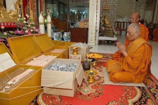 This gold leaf will acquire a very fluffy appearance over the years, which is seen as a mark of authenticity in recognising both the amulets of Luang Phu Tim (Wat Laharn Rai) and Luang Por Sakorn, for their method of amulet making and Sacred Ingredients are part of the secret that causes the gold leaf to fuse with the sacred powders and acquire the fluffy texture they are so famous for. It is a fact that that as Luang Phu Tim was still alive, and his Looksit would ask 'if you are not around, then who should i go to?' - Luang Phu Tim would always reply 'Go and see Luang Por Sakorn, he learned all he has to know from me'.