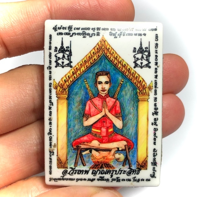 The rear face is stuffed with a thick layer of Sacred Powders, which have two silver Takrut and four Ploi sek (gems that have received incantations) embedded in the Sacred Powders. A Phial of Prai Oil is also embedded into the Muan Sarn. In addition, for this Pim Yai Large Size Ongk Kroo versio, a Phial of Pong Sanaeh Ya Faed is also embedded into the Muan Sarn with some extra Pong Look Krok. Incredible Power of Multiple Items of Individually Empowered Prai Sorcery combine to make this Immensely fast working Maha Sanaeh Charm, with the Wicha of Ajarn Wirataep Yan Kroo Prasit, and 7 great Masters of Wicha Maha Sanaeh to add their Empowerment to the Wai Kroo Ceremony of Ajarn Wirataep.