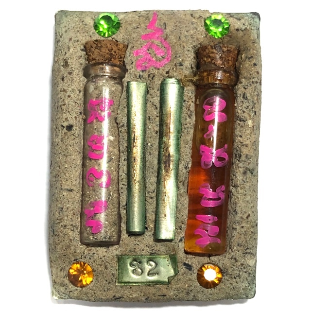 The Bone Powders of a Look Krok are the base element in the Sacred Muan Sarn that is stuffed into the rear face of this Painted Enamelled Shell Locket face, with Prai Kumarn Powders and 108 types of Sacred Herbal Pollens and Woods added. The Muan Sarn is then embellished and further Incrementation of Prai Power is given with the addition of a flask of Prai Oil, a flask of Pong Sanaeh Ya Faed, with Look Krok Powders, 1 Silver Takrut Hua Jai Por Khun Phaen (Khun Phaen Heart mantra, and 1 Takrut Hua Jai Jao Chu Maha Sanaeh (Heartbreaker Spell), and some 'Ploi Sek' (enchanted gemstones). Sacred Khom Spell Inscription is then written around the sides of the amulet.