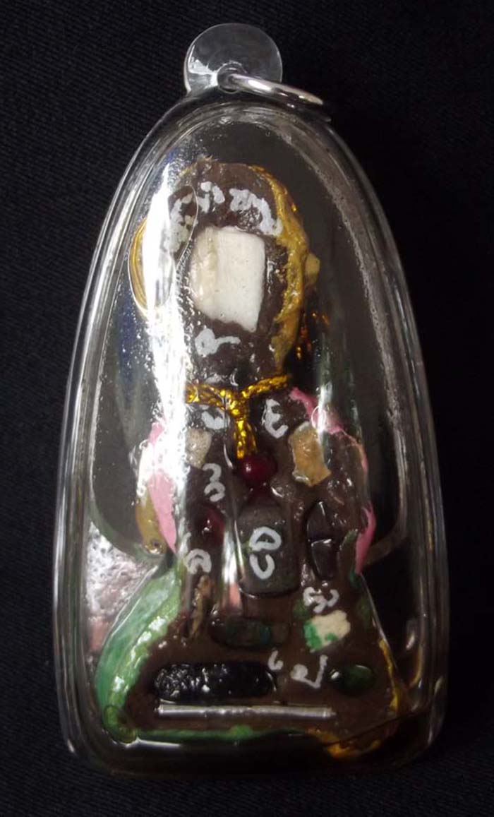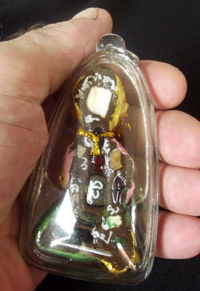 After the Bangsagun Bpen Bangsagun Dtaay Ritual was completed, the Kumaree were 'laid to rest' again first, as Pra Ajarn Taep then Inscribed Takrut upon the Coffin Lids, using Yantra of the Choke Lap (Luck and Windfalls) variety (the Sacred 'Na Kin Bo Liang'). He inserted this along with a small phial of 'Nam Man Prai 108', a mixture of many different powerful Prai Oils which Pra Ajarn Taep has made and also collected from his Masters over the Years, and mixed together into one Mega Powerful Potion, and Re-Enchanted with additional Wicha of the Kumaree. He inserted pices of 'Mai takian Sorng Roi Pi', a Sacred 200 year old Takian Tree with a Mae Takian Ruling Deva Spirit inhabiting. Sacred stones from the bottom of the Mekong River were inserted, Ploi Sek (Enchanted Gemstones), a 'Look Om Sam Prai' (Holy Sacred Powder Ball with bone powder of three Prai Ghosts), was also embedded in the rear face of the Kumaree. One piece of 'Chin Aathan Nong Ueay' Ghost Bone was then also Inserted and the Final Invocations were made to Bind the Spell. The Kumaree Nong Ueay was then immersed in Nam Man Look Krok, to charge up the power of the Prai Magic within the Kumaree and increase its range and effects, and was then encased in sealed waterproof acrylic bubble casing.