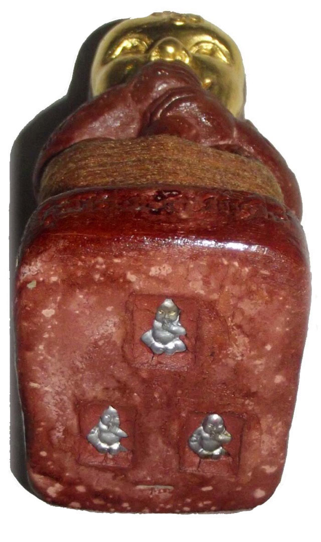 This Kumarn Gao Got Kumarn Gao Gote metallic Loi Ongk Statuette inserted into the base. This statuette was made from Sacred Metals resulting from the smelting together of first and second edition Kumarn Gao Gote amulets and Muan Sarn. In addition, the third edition metallic Loi Ongk statuettes were also smelted in to the Alchemical Alloy, to make it not singly, not doubly, but triple strength.