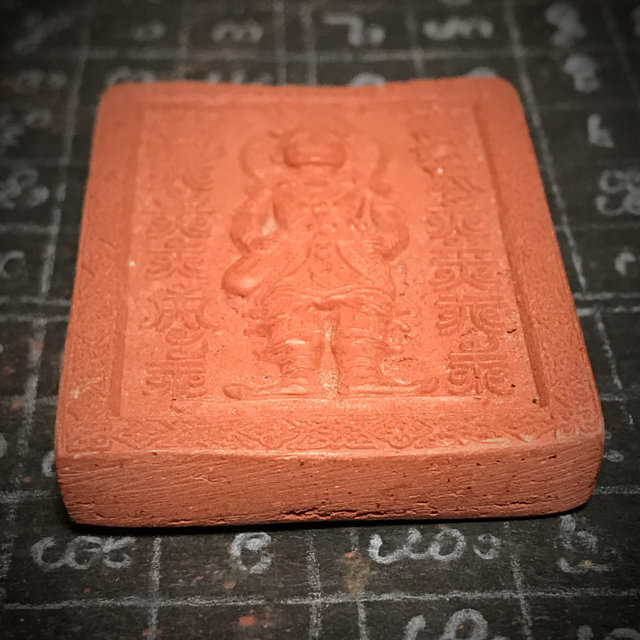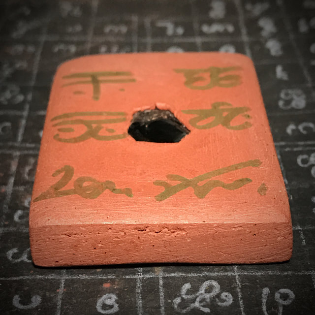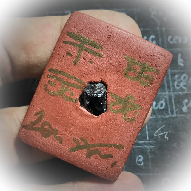 The rear face has hand made Sanskrit Spell Inscriptions from Kroo Ba Beng, one Ploi Sek Maha Pokasap Enchanted Black Gemstone, and a ghost bone fragment, invisibly hidden within the interior clay of the amulet.