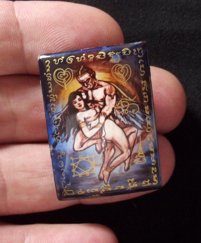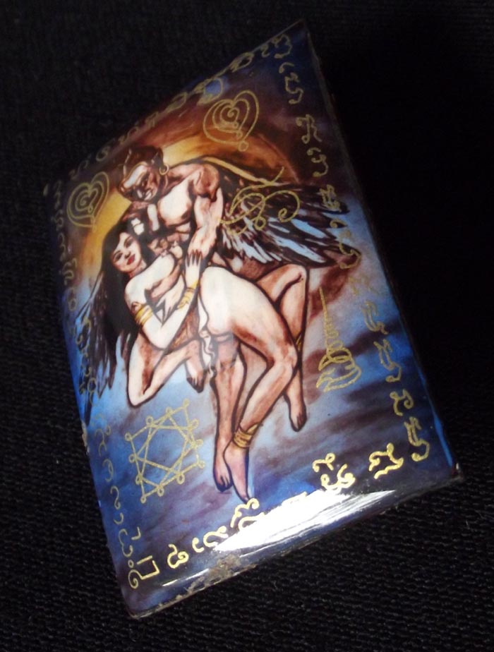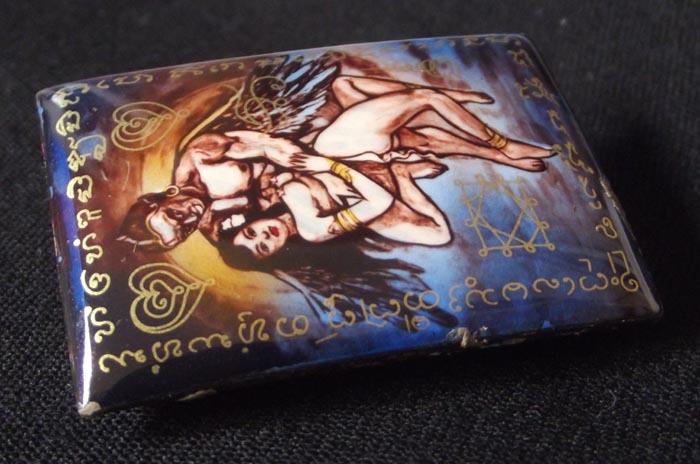 The front face features two Devas embracing in mid flight, with Sacred Agkhara Spells in Ancient Lanna Script. The rear face is filled with 'Pong Maha Sanaeh Kamataep' and has a silver Takrut with a Maha Sanaeh spell within it, one piece of 'Mai Marum' and one piece of 'Mai Swas' - two Sacred Magical Tree woods that have been used for Centuries as a Powerful Maha Sanaeh attraction and wealth increase Sorcery. A small phial of 'Nam Man Mont Sanaeh Kamakun' is embedded into the thick Muan Sarn powders. Nam Man Mont Sanaeh Kamakun is a very rare to find Prai Oil, specifically aimed at increasing sexual attraction and to arouse the passions.