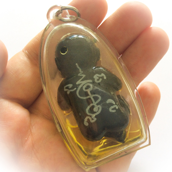 The Look Krok is made from a very highly concentrated Muan Sarn composed of Prai Oils, Bone Powders and Funeral Ashes, Sorcerous Earths and Magical Herbal ingredients. This smaller version of the 5 inch Bucha Kroo Edition is encased in a water proof casing for wear. Nam Man Prai and magical herbal oils have been added to continuously charge the effigy. The Look Krok will suckle at the Nam Man Prai oils, retaining its necromatic Prai charge.