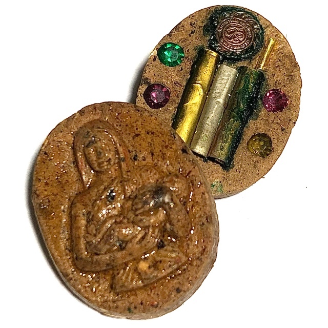 The amulet features the image of a Mae Hoeng Prai, with a Kumarn Baby in her arms, emitting great Metta Mercy Charm and Compassion Attractiing Magic. The rear face is is embellished with 4 Ploi Sek Maha Pokasap Wealth and Treasure attracting enchanted Gems, Three Takrut (Sam Kasat) are inserted into the rear face; 1 silver, one golden, and one bronze colored Takrut Masya Hlong Samutr spell with the Yant Masya Long Samutr (Mermaid lost under the ocean lovespell) inserted and imbued. Empowered by Pra Ajarn Oe, and Issued in the year 2558 BE.