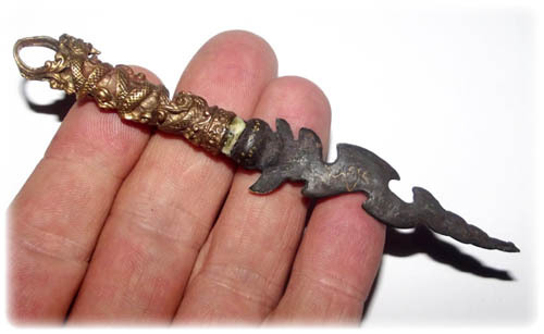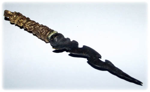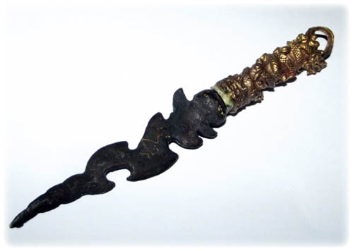 The magic formulas within this ritual dagger consist of the eighty-eight Dhamma Khandas and invocations that call upon the Four Devas of Cosmic Weaponry ('Taep Sastrawut') to keep evil beings away. Besides the invocations of the Naga deity, the kata Hnun Taat See and the kata Agarn Sam Sip Song were also chanted during the empowerment session performed by Luang Por Prohm.