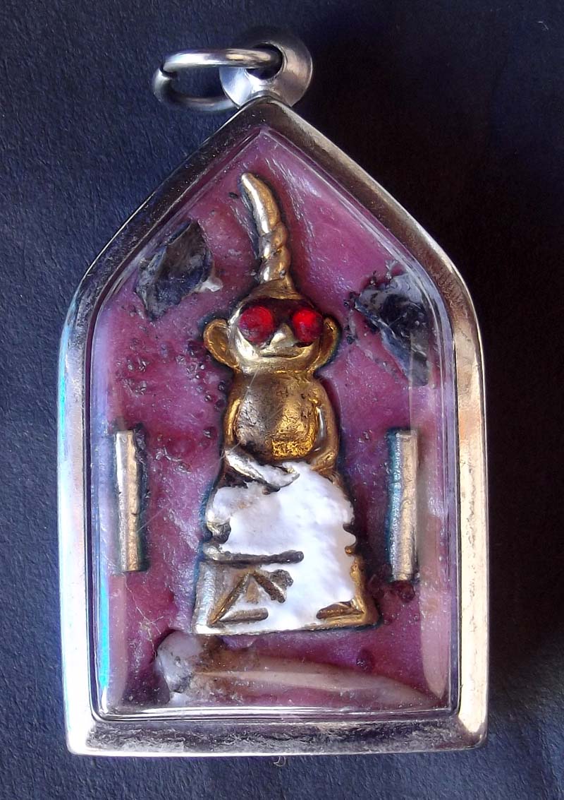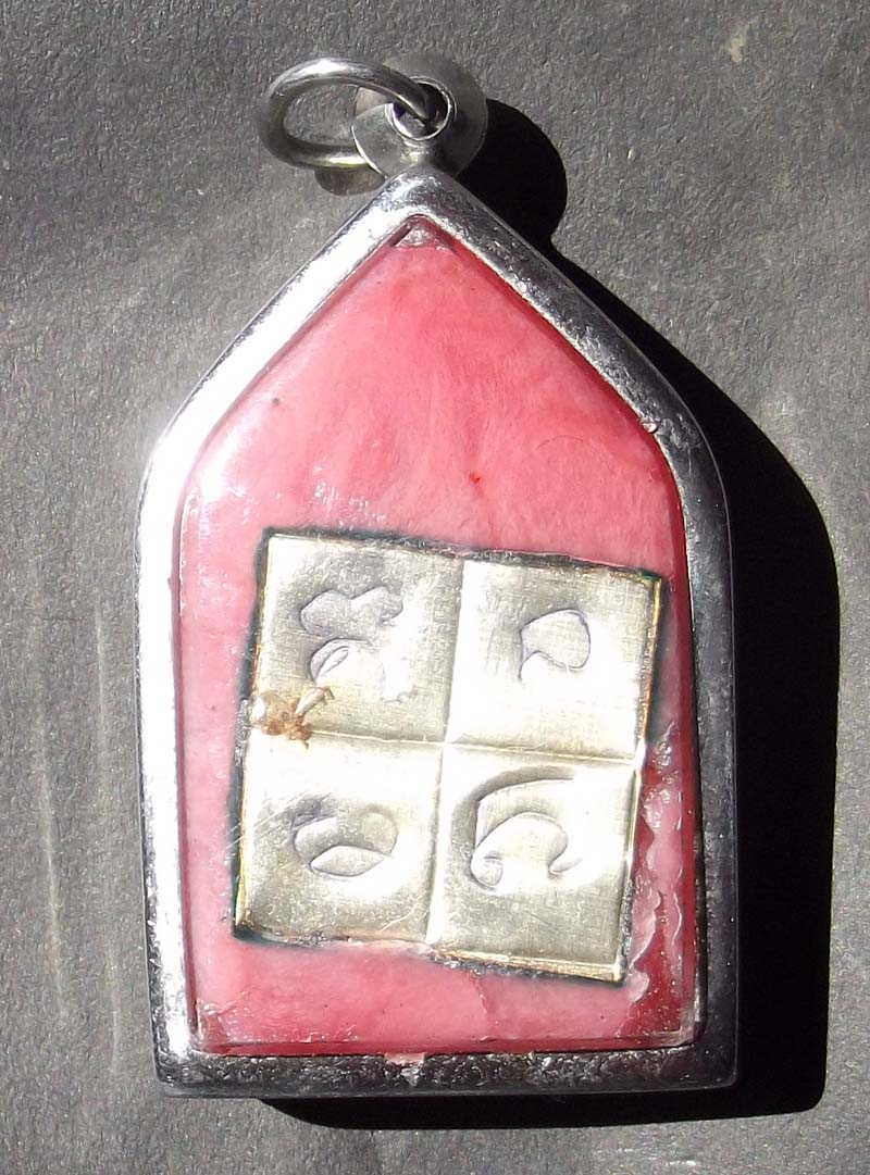 This amulet is indeed a full potion of spells with an extremely sacred and several powerful pieces of 'Chin Aathan' inserted, including a human tooth. Chin Aathan is a Prai Magic - a piece of relic (bodily remains, such as bone, blood, tooth, skin) of a poor person who drowned to death on a Saturday and was Cremated on a Tuesday, which is a very powerful combination of events to make magic for riches and luck, and love and attraction (enchantment magic). The See Pheung Balm also containes 'Prai Luead' (Blood from the Prai). Two golden Takrut are inserted in the front of the amulet each side of the Ngang,surrounded by pieces of Chin Aathan. The bottom piece is a tooth. If you are lkooking for a most powerful amulet for pro-active Maha Saneh magic, this is probably as powerful as it gets as far as Occult Charms go. For Flirts and Gamblers this is definitely a good choice for effective results.