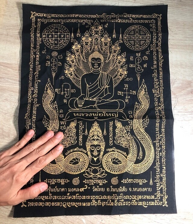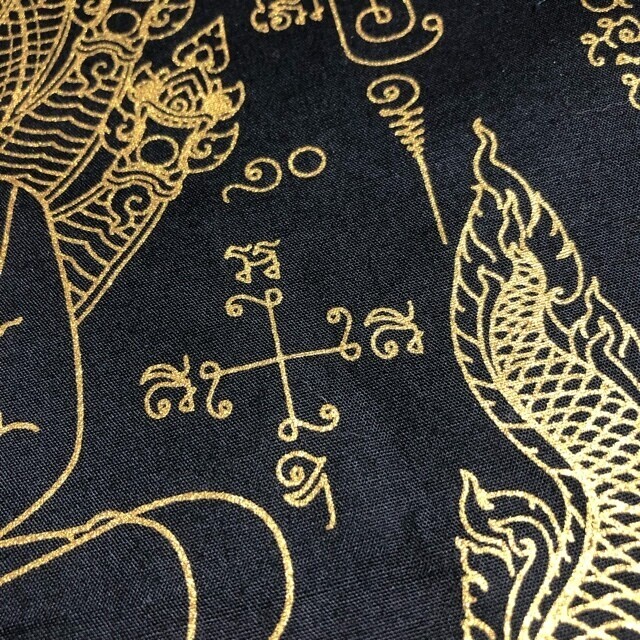 The Pha Yant has an image of Luang Por Yai Buddha in the center, flanked by Naga serpents, and is surrounded by Sacred Khom Agkhara inscantations, and Sacred Yant and Sacred Na spoells adorning the central image.