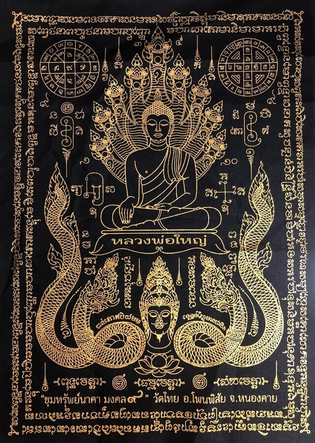 Pha Yant Luang Por Yai Run Khum Sap Naka Mongkol 9 Auspicous blessings of the Nine Headed Naga King, in Gold on Black cloth, from Wat Thai in Amphoe Pai Piboon, in Nong Kai, Isan Country. The Pha Yant were blessed and empowered in Tewa Pisek and Putta Pisek (Deva and Buddha Abhiseka) ceremony, to invite the Naga Kings to come and empower the amulets on the 16th October 2564 BE.
