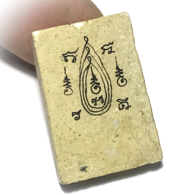 This exhibit is unusual that it was one of the lucky few to receive hand inscriptions of Khom Agkhara as additional blessing. This occurs when a devotee receives an amulet and beseeches one of the monks to inscribe and bless it, which many devotees like to do, either when attending a blessing ceremony, or even when they visit the temple to make merits. It is a very common practice for a devotee to place his amulets on a tray to give to the monk to bless and hand back.