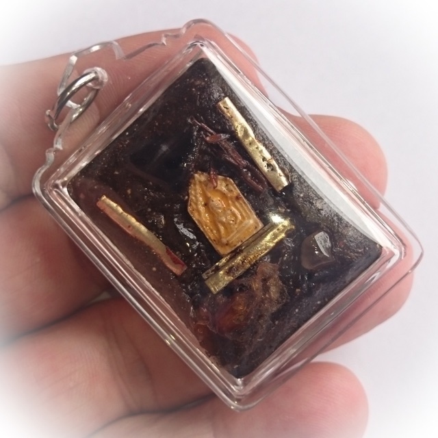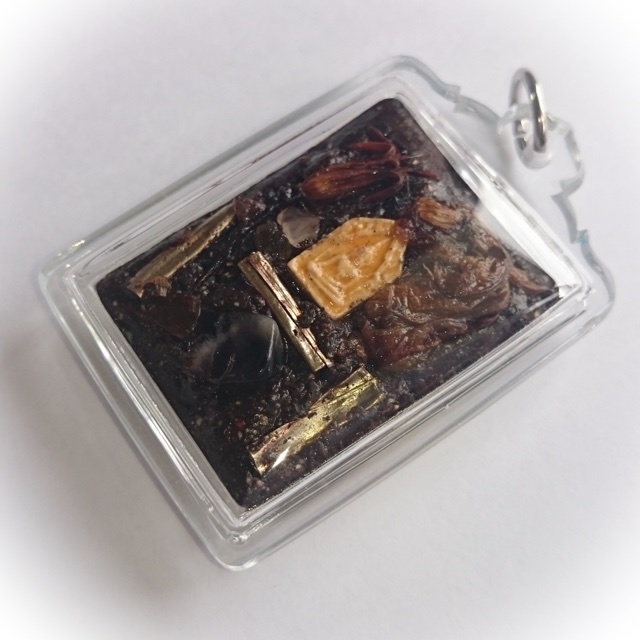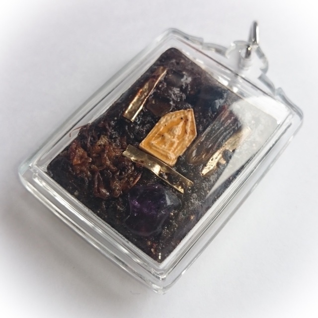 Above; Prai Maha Sanaeh Powders on rear face of locket, Takrut Maha Sanaeh Gariang Kor Ma from Luang Phu Bpan of Wat Na Dee Sacred Flowers and Gemstones