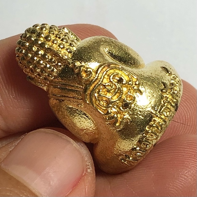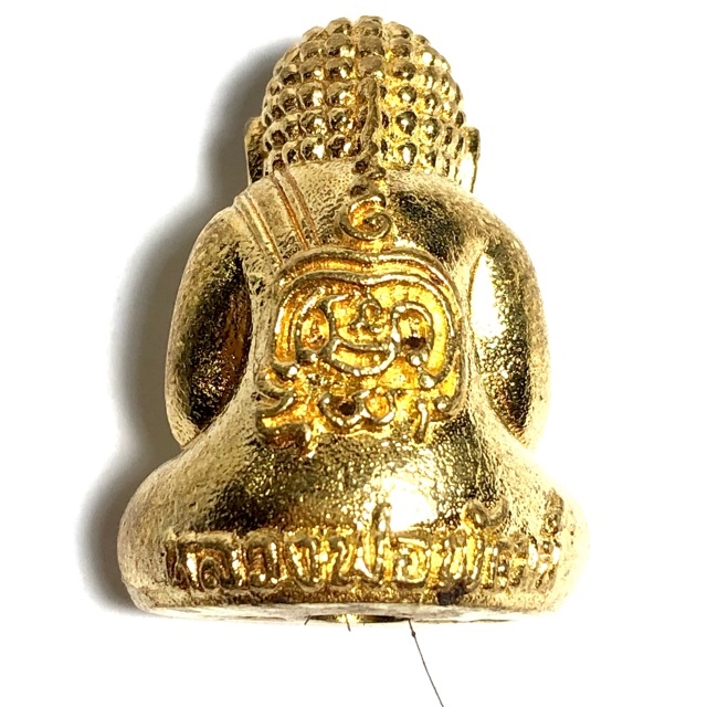 This particular exhibit is in Nuea Rakang, sacred temle bell brass, with the base filled with Pong Toop Incense Powders from Monks Praying to the Buddha, Gesa Hair strands, and Jivara Robe shreds of LP Pat. with Gold Leaf, and 1 Solid Gold Takrut spell inserted into rear face. This version is an Ongk Kroo Gammagarn Version, and was only made in a limited number of we believe 99 amulets only.