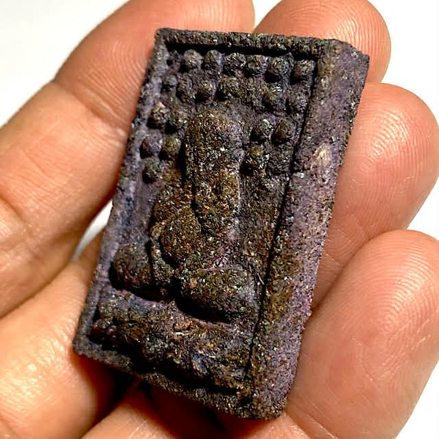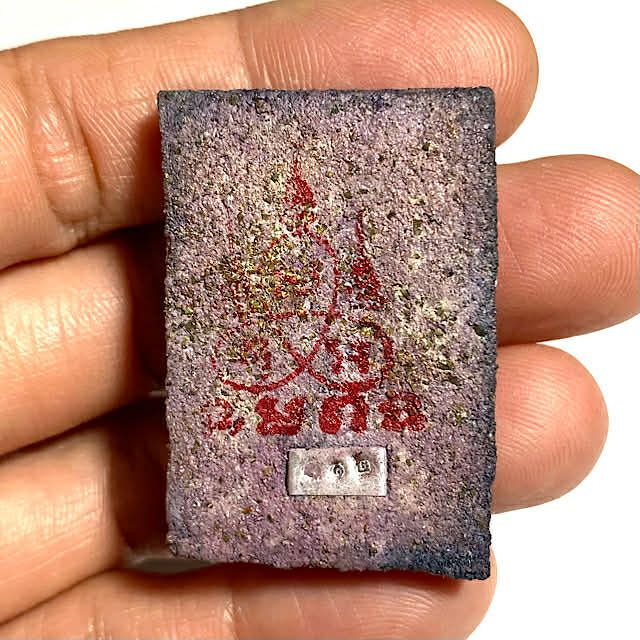 The amulets were made in the following colors; White, Black, Blue, Green, Dark Orange, Purple, Red, Yellow, and Gon Krok ('bottom of the mortar bowl' effect mixed colors). The 'standard' (nothing common or 'standard about this edition really!) models, are also inimitable and no two amulets exactly the same, some with Paeng Jerm sacred talc past from the hand of the monk to bless the amulets individually, or a piece of Civara Robe or Corpse cloth pasted onto the front face, etc. Standard models all have either the Yant Tri (Yant Maha Ud) on the rear face, with a metallic code stamp, with some special ones having insertes in the rear face, as previously mentioned.