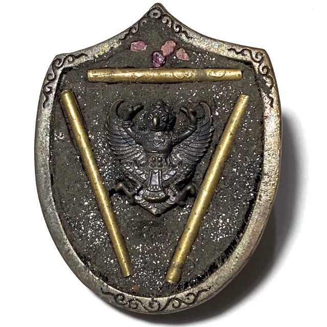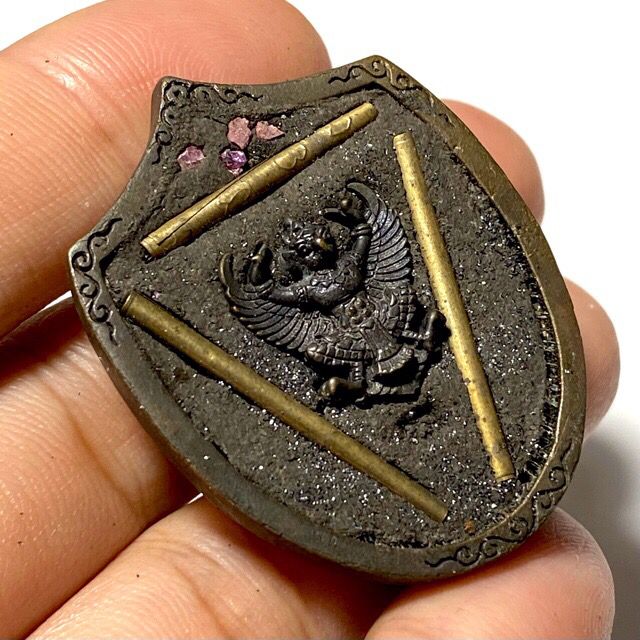 The Rear face is filled with Muan Sarn Maha Lap Maha Choke (Sacred Powders with powers to increase Luck, Good Fate and Prosperous Fortunes). Three Takrut Serm Duang for improved Karma and Fate are inserted, along with a Garuda bird for the Power to overcome and rise above obstacles, enemies and dangers, and a sprinkling of sacred Ploi Sek Maha Pokasap blessed gemstone fragments for wealth attraction.