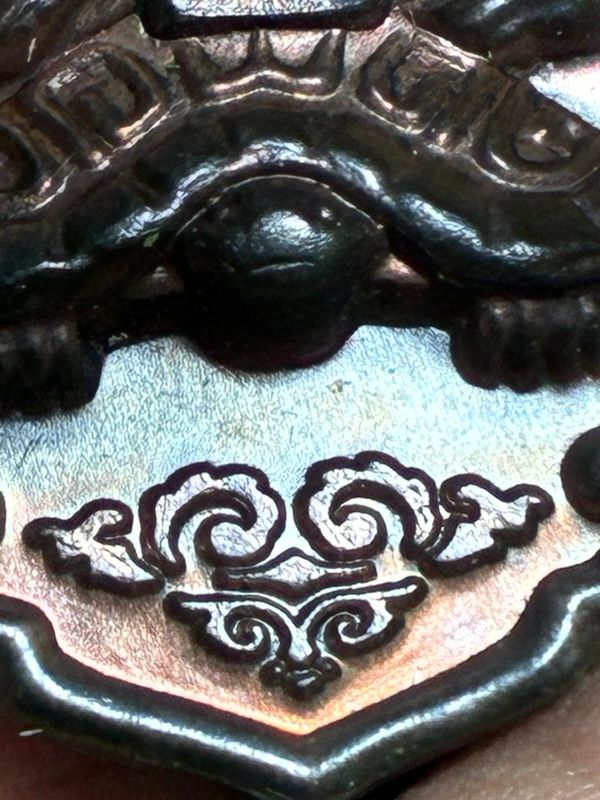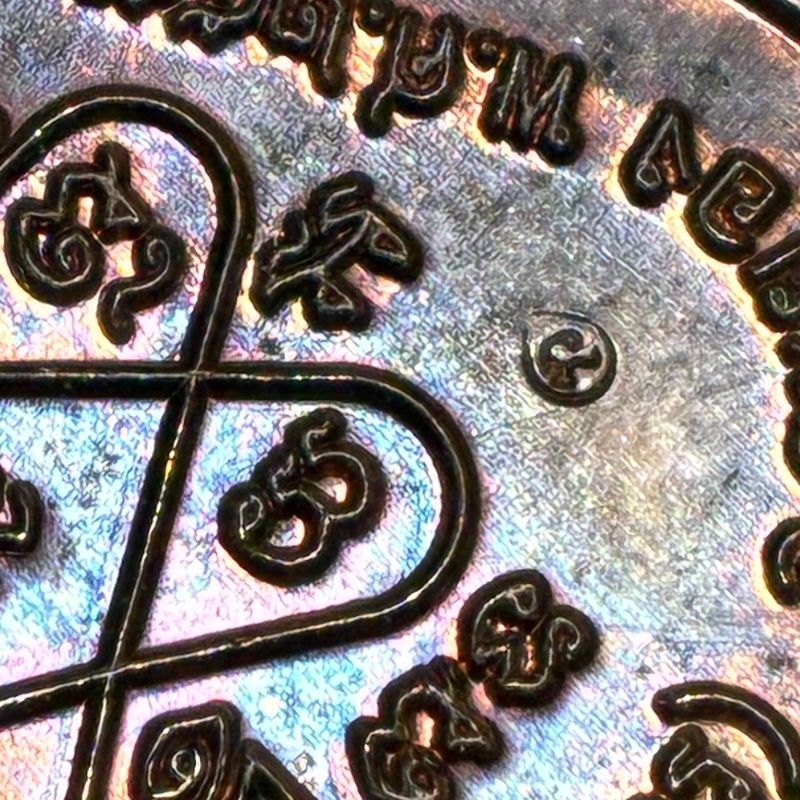 The nava loha alloy, which is of particular interest here, is composed according to ancient metallurgical doctrine using nine auspicious metals, namely gold, silver, copper, chin, blue alloy, zinc, liquefied iron, mercury, and lead. The successful fusion of these metals requires a disciplined and technically demanding process to achieve harmony, stability, and the dark, dignified tonal qualities associated with potent nava loha. Typically, nava loha Pokasap coins from this issue display a deep brown to near black surface, sometimes revealing natural silver or gold iridescence caused by oxidation interacting with the precious metal content.