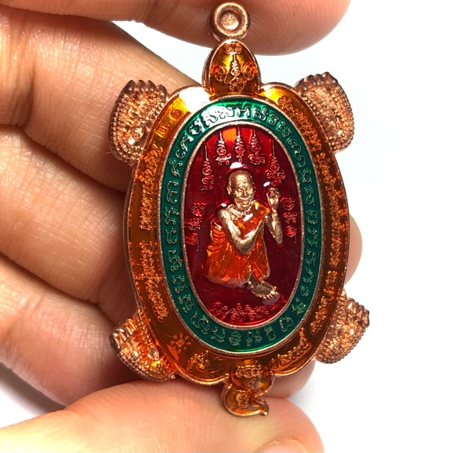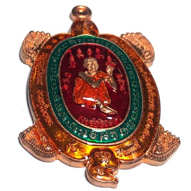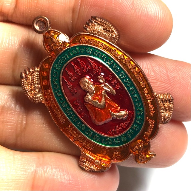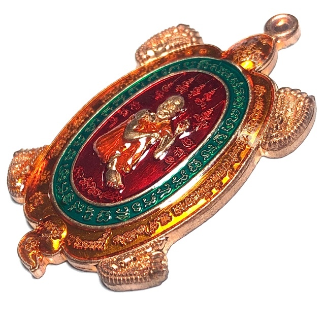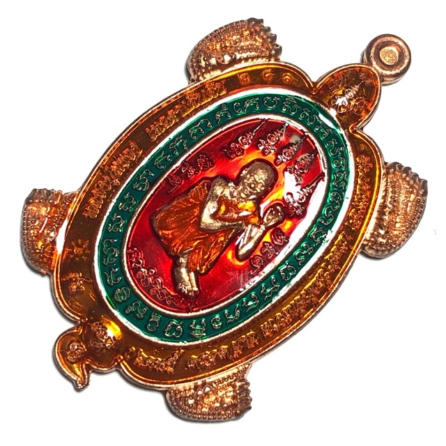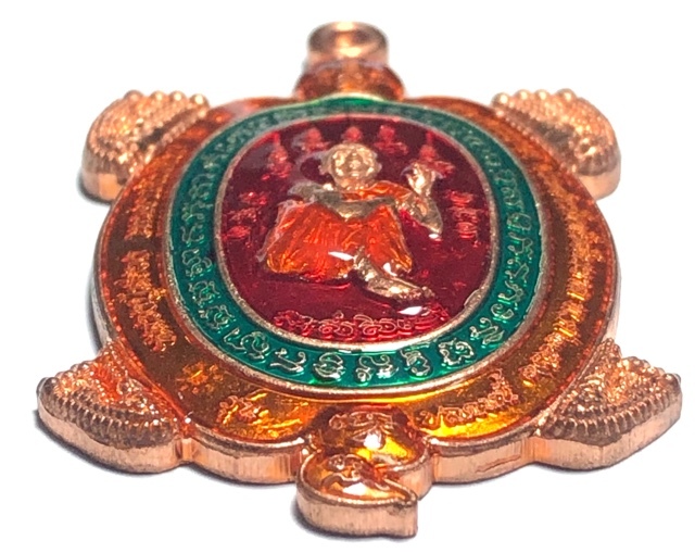Rian Paya Tao Ruean Sacred Turtle Coin Amulet, with Luxurious Ya Rachawadee Enamel Glaze in Red, Green, and Orange, with Monk image of the Great Miracle Monk, Luang Phu Suang (Tewada Len Din 500 Pi), emblazoned in the center, and the Yant Paya Tao Ruean Turtle Yantra on rear face. The coins have a code stamp on the upper left of the border of the front face of the amulet. This Pim was a special model
