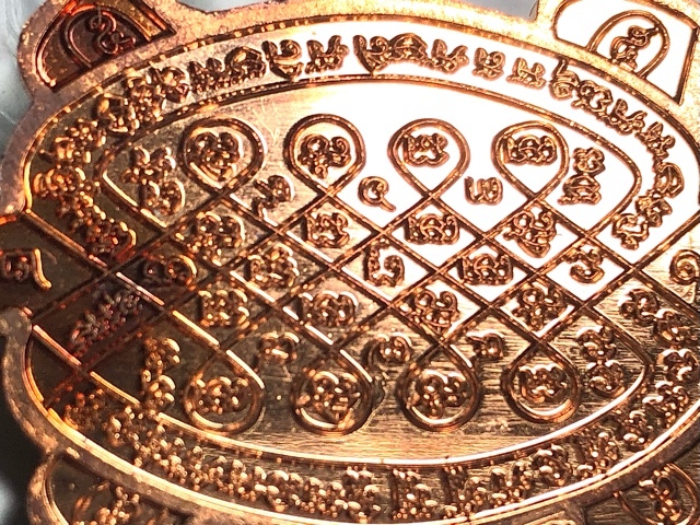 This model is cast in Nuea Tong Daeng, composed of Sacred Copper alloy, made from Yantra Foils and previous editions of Luang Phu Suang and Rian Tao Ruean amulets smelted together. The amulet has then been glazed with Ya Rachawadee Enamels. Below; Yant Paya Tao Ruean – Great Turtle Yantra on rear face; excellent auspicious blessings, riches, treasures (Pokasap), health and long life from this Yantra as well as Kong Grapan. The Yant Tao Ruean is also very popular as a Sak Yant Magical Tattoo.