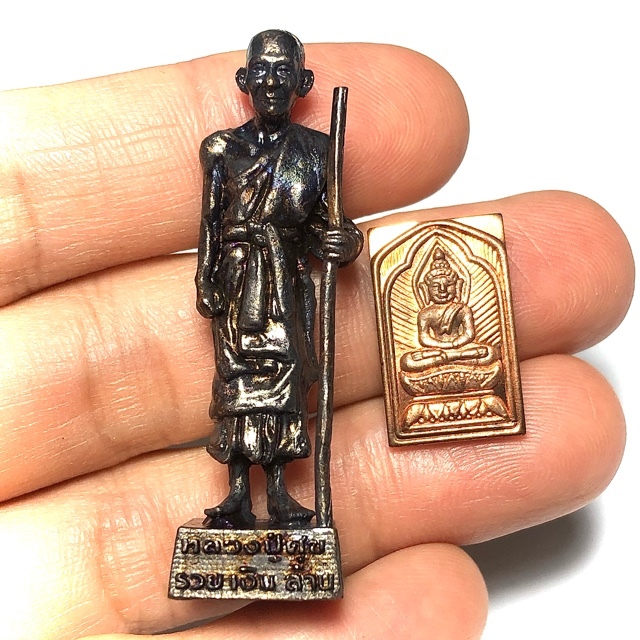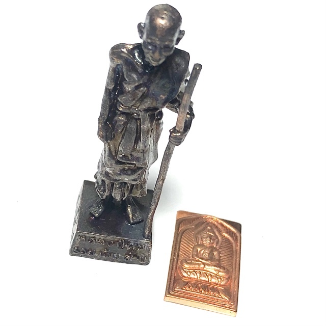 The Loi Ongk Statuette stands four Cm high. The base has This is a special set of Amulets, all of which the statuette and Buddha Coins were cast, from sacred metals taken from residues of the casting ceremony of the making of the world's largest statue of the great monk Luang Phu Sukh of Wat Pak Klong Makham Tao.