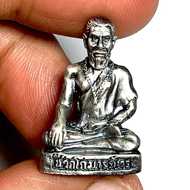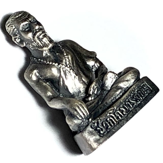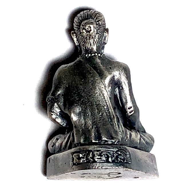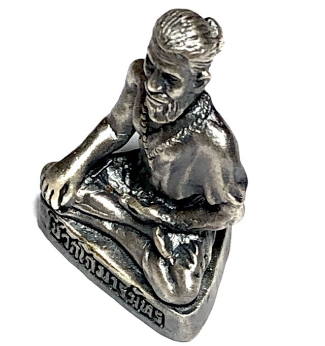 This Jivaka Rishi amulet (Ruesi Chiwok in Thai), was made as a small Loi Ongk statuette for the modern Business person who often is out of the store and works traveling in the field much more these days. The statuettes were made in various substances, including Rom Dam, Nuea Ngern Pon Sai, Nuea Satin, Tong Pon Sai, and Sam Kasat. This exhibit is in Nuea Satin, Sacred Chanuan Metallic alloy with a luxurious polished satin coated silver-pewter coating.