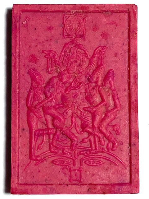 Sadej Mae Yua Mueang is one of Ajarn Hmoms more imaginative and artistic creations of Maha Sanaeh charms. In truth, the Sadej Mae Yua Mueang is in fact the Hindu Deity Kali in the Mudra of Sexual intercourse. But Ajarn Hmom says 'Do not think of dirty things when you see this amulets design, because all animals and Humans in this World were born from these Two Deities who are intertwined in this amulet, namely the Yoni (female organ) and four Siwalingk (Shiva Lingam), with Kali in consummation poise. This is known as see rum hneung (4+1).