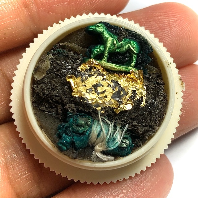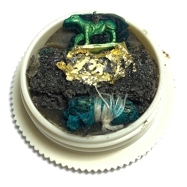 The metta balm also features two tiny silver takrut that are put together by a white cord used for spell binding. For the rest we can see the balm is supplemented with a In Koo deity stattuette and a small In Ma horse symbiotic prai deva which is covered in gold leaf.