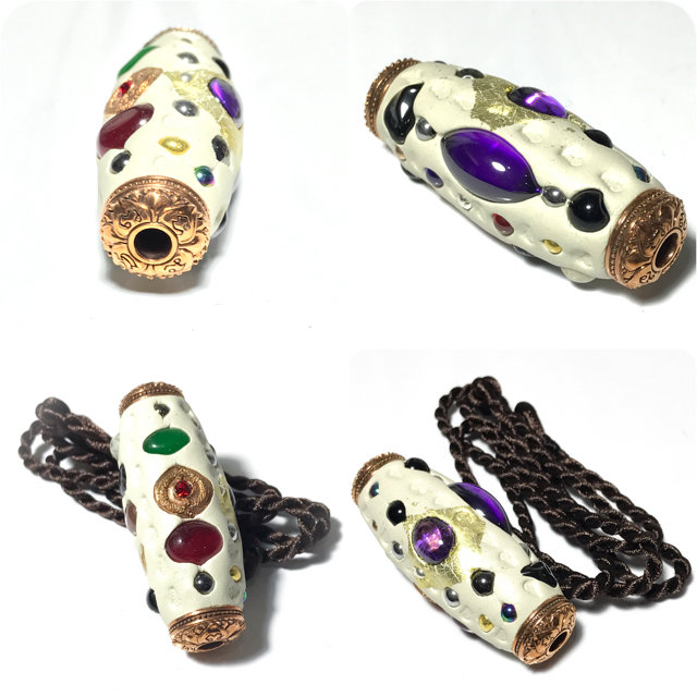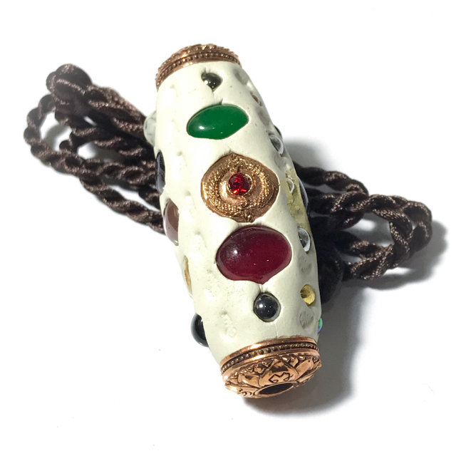 The Takrut, is covered with sacred muan sarn substance, which is completely stuffed full of Sacred Relics, and Maha Pokasap Beads, with Lek Lai Adamantine Substance. The Takrut is attached to a neck cord, for it is important for the Muan Sarn of the Takrut to touch your skin. The short cord will allow you to wear it around your neck. The cord can be removed and encase the amulet in Waterproof Casing if wished, and still receive power, but the Takrut is made for contact with the skin for maximum effect from the Kaya Siddhi Elements and Muan Sarn Sacred Powders. In the end, the choice is yours, for we provide both options.