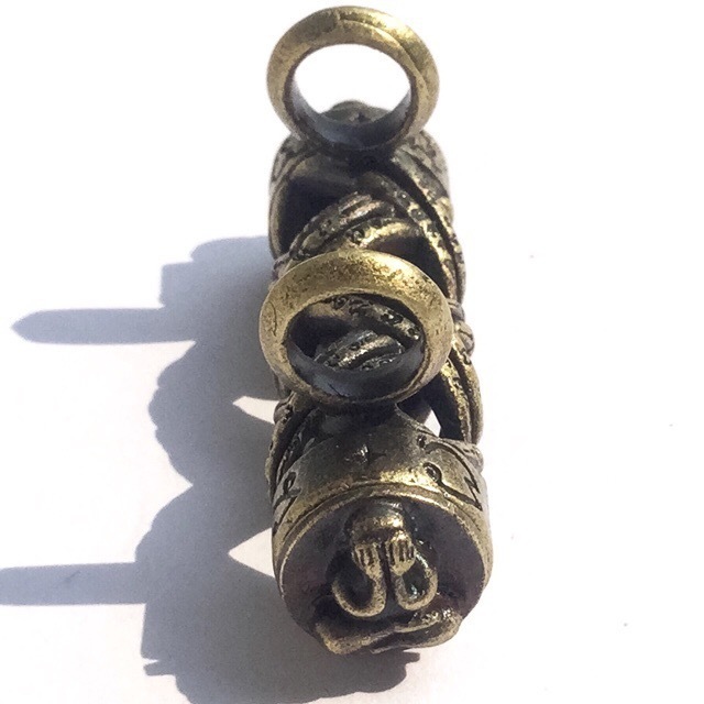 The ends of the Takrut are sealed with Pra Pid Ta Maha Ud Nirodha Buddhas, to increase the Maha Ud Power and seal the Magic within, preventing any leakage over the passage f time, and protect the Wicha from any outside Evil Forces or Curses which may be used against the wearer. The Takrut can be worn on a pendant chain using the hoops which are forged onto the amulet, with or without Waterproof Casing as desired. You can also wear the Takrut on a 'Chueak Takrut Kart Aew' cord belt, for wearing around the waist (with or without Waterproof Casing).